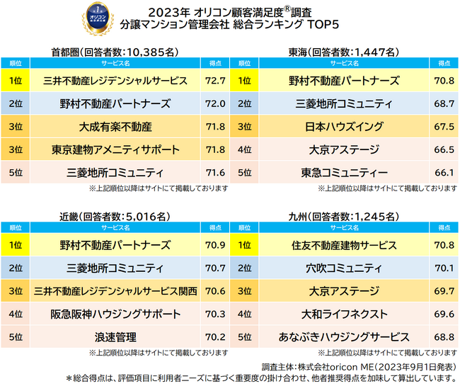 【野村不動産パートナーズ】が『東海』『近畿』で2冠 /【住友不動産建物サービス】が『九州』で初の総合1位