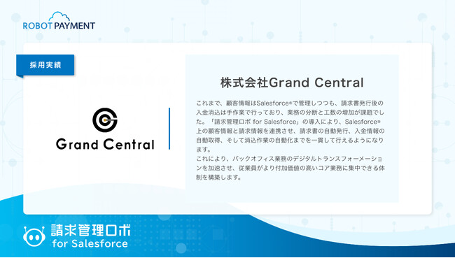 企業のお金の流れを円滑にし、新たな価値創造を促進する株式会社ROBOT PAYMENT(本社:東京都渋谷区、代表取締役執行役員CEO:清久 健也、証券コード:4374、以下「ROBOT PAYMENT」)は、請求・債権管理システム「請求管理ロボ for Salesforce」が、株式会社Grand Central(以下、「Grand Central」)に採用されたことをお知らせします。