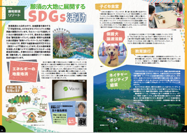 日本テーマパーク開発、藤和那須リゾート、那須興業の3社は、一般社団法人ナスコンバレー協議会が発行した教材「未来を拓くイノベーション探求BOOK ~ナスコンバレーに学ぶ~」において、自らが行っている様々なSDGs活動についてご紹介をさせていただきました。ご紹介させていただいた内容は、3社が取り組んでいる、保護犬譲渡活動「SOS活動」、JR東日本・那須塩原駅で行っている「エキナカこども食堂」、非常用電源としても活用できる自家消費型の小型木質バイオマス発電機を活用した「那須ハイランドグリーン構想」です。