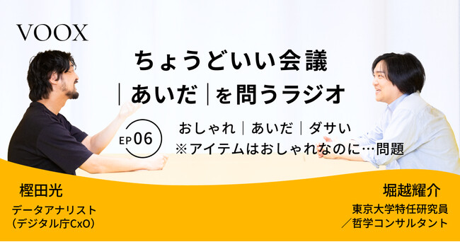 堀越耀介氏(東京大学特任研究員/哲学対話)と樫田光氏(デジタル庁/データ分析)。異なる専門性を持つ二人が世の中の様々な「白か黒か、どちらか一方に割り切れない物事」=“あいだ”について語り合います。何かと何かの“あいだ”を切り口に問いを進めることで予測不能な化学反応を生み出し、聴く人に新たな気づきを与えてくれる。そんな"ちょうどいい"を探求する二人のクロストークをお楽しみください。