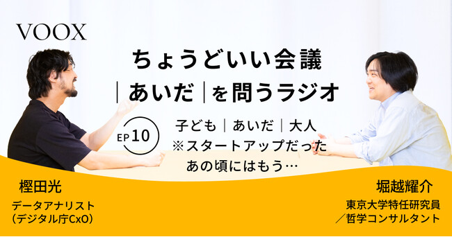 堀越耀介氏(東京大学特任研究員/哲学対話)と樫田光氏(デジタル庁/データ分析)。異なる専門性を持つ二人が世の中の様々な「白か黒か、どちらか一方に割り切れない物事」=“あいだ”について語り合います。何かと何かの“あいだ”を切り口に問いを進めることで予測不能な化学反応を生み出し、聴く人に新たな気づきを与えてくれる。そんな"ちょうどいい"を探求する二人のクロストークをお楽しみください。