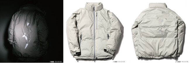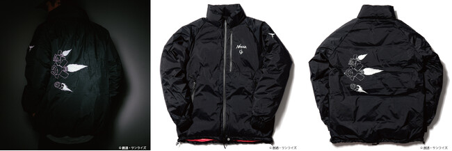 デザインは背中にνガンダム、サザビー其々のファンネルデザイン、左腕と胸にワンポイントにて各マークをリフレクタープリントで施した1点。裏地は各MSをイメージしたカラーを採用。