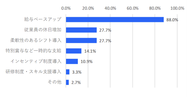 続いて、「実施した」と回答した飲食店に実施事項を聞いたところ、「給与の引き上げ(ベースアップ)」が88.0%とダントツの結果に。次点は「従業員の休日増加(27.7%)」「柔軟性のあるシフトの導入(27.7%)」でした。