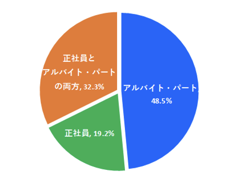 まず、足りていない雇用形態について尋ねたところ、「アルバイト・パート」が48.5%、「正社員」が19.2%、「アルバイト・パートと正社員の両方」が32.3%という結果になりました。特に「アルバイト・パート」の人手不足が深刻で、80.8%もの店舗が「アルバイト・パート」が足りていないと感じています。また、2月の調査と比較し、正社員の不足が3.5%上昇しています。