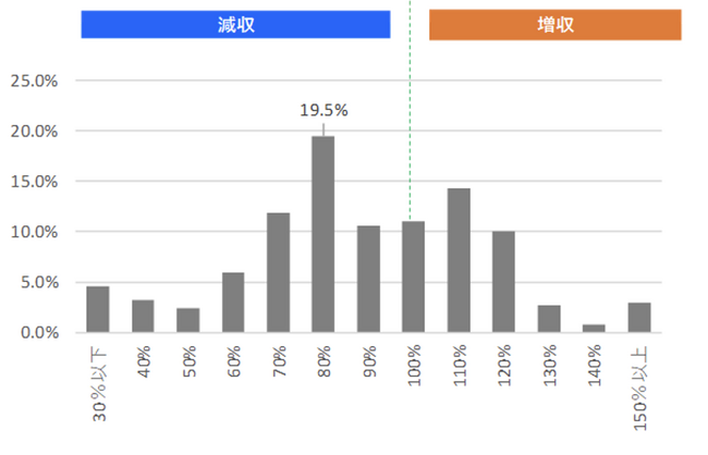 次に、コロナ前である2019年同月と比較し、売上の割合を聞いたところ、最も多かったのは「80%(構成比:19.5%)」という結果になりました。