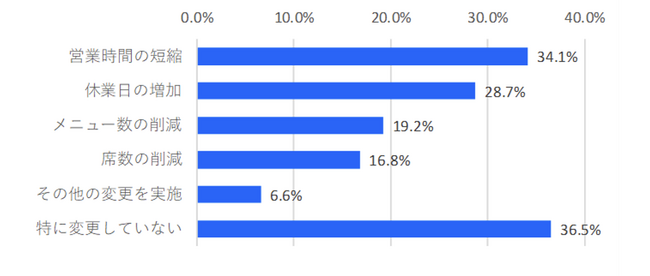 さらに、人手不足によって店舗の営業活動・方法を変更したか、実施経験のあることについて質問したところ、6割越えの飲食店が何らかの営業活動や方法を変更したことがわかりました。うち最も多かったのは「営業時間の短縮(34.1%)」、次点が「休業日の増加(28.7%)」という結果になりました。