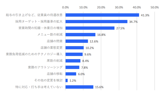 次に、このまま人材不足が続いた場合、どのような対応・打ち手を考えているかを聞いたところ、「従業員の待遇改善(41.3%)」「採用ターゲット・採用基準の拡大(34.7%)」という採用関連の項目がトップに。中には「店舗の閉業(12.6%)」を考える方もいる一方で、「特に対応・打ち手は考えていない(15.6%)」という方も一定数いる結果になりました。
