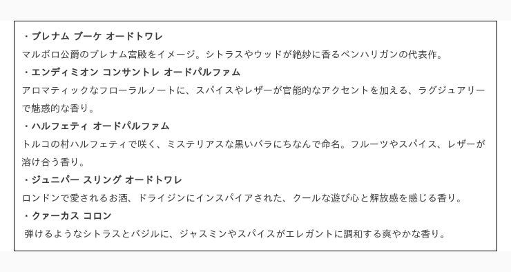 日本未発売の香りを含むペンハリガンの10種の香りを一度に楽しめる特別なセット。ペンハリガン ファンはもちろん、ペンハリガンのいろいろな香りを試してみたい方にもお勧めです。