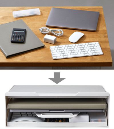 PC作業に必要なアイテムをひとまとめにでき、作業時はスタンドを立ててノートPCをセットすれば、すぐに仕事空間を整えることができます。