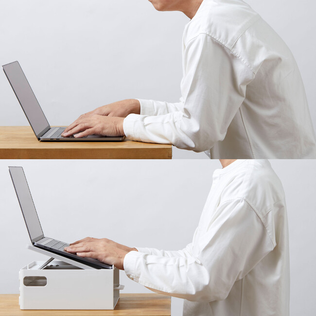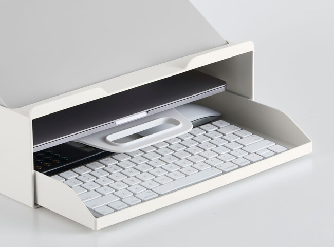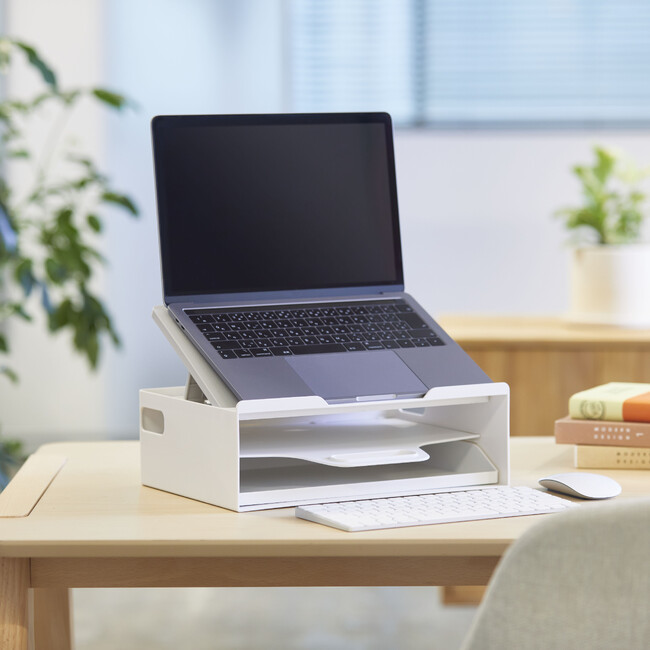 ノートPCとマウスやキーボードなどのワークツールをひとまとめに収納できます。A4のボックスファイルと同サイズのため棚にスッキリと収まり、上部のスタンドを上げるとPCスタンドとして使用可能です。スタンドは4段階で高さが変えられるため、ノートPCの画面を最適な高さに調節できます。市販のPCスタンドよりもスタンドの位置が高いため目線を上げた姿勢を保つことができ、長時間の作業による疲労を軽減します。14インチまでのノートPCに対応し、ワークツールが取り出しやすい引き出し付きです。