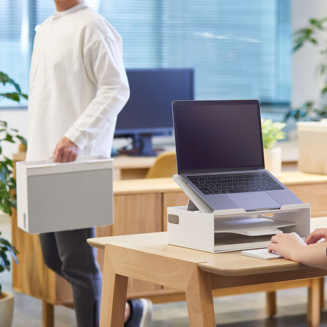 「ノッテオン」はワークツールをひとまとめにできる収納ボックスとしての機能と、ノートPCスタンドとしての機能を兼ね備えた製品です。フリーアドレスのオフィスや自宅でのテレワークなど、限られたスペースでも快適な仕事空間を作り出すことができます。