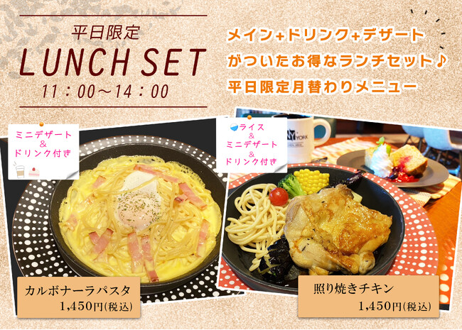 New York Kitchen ARAIリーフウォーク稲沢店(運営:株式会社RAVIPA 本社:東京都豊島区)では、平日限定ランチセットが新しくなりました!ミニデザートドリンクがついてくるお得なセットとなっております。