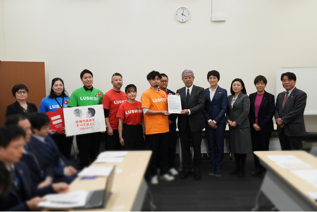 英国発のナチュラルコスメブランドLUSH(ラッシュ)は、本日11月27日(木)、超党派議員連盟「LGBTに関する課題を考える議員連盟」の総会にて、同性婚の法制化実現に向けた国会での審議を求める要望書をラッシュジャパン合同会社として提出いたしました。今回の要望書提出は、2022年より「公益社団法人Marriage For All Japan - 結婚の自由をすべての人に(以下、マリフォー)」と連携し、継続的に婚姻の平等を求めてきたラッシュジャパンが、企業の立場として変革に向けて行動を起こしたものです。