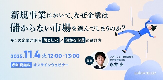 アスタミューゼ株式会社(本社:東京都千代田区、代表取締役社長 永井歩)は、2025年11月4日(火)12:00-13:00に、無料ウェビナー「新規事業において、なぜ企業は儲からない市場を選んでしまうのか? ~多くの企業が陥る落とし穴と儲かる市場の選び方~」を開催いたします。