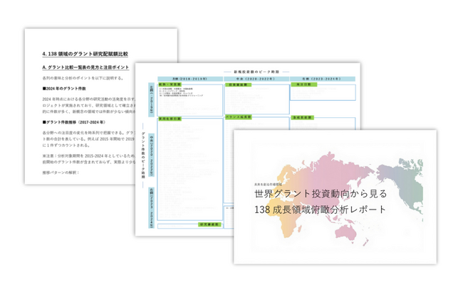 アスタミューゼ株式会社(本社:東京都千代田区、代表取締役社長:永井歩)は、世界40近くの研究助成機関や政策投資データをもとに、2030年以降の成長が期待される「138の成長領域」を俯瞰的に整理した新レポート『世界の研究開発投資動向から見る138成長領域俯瞰分析レポート』を公開しました。
