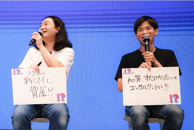 最後に、ゲストの「ワタシのヨコク」も発表していただきました。加賀さんのヨコクは「加賀、オモシロカンパニーのコンサルタントに!?」でコクヨのコンサルタント就任の野望を語っていただきました。また、賀屋さんからは「コクヨの新CMに賀屋!?」というしたたかな野望を発表いただき、大盛況のうちに第一部は幕を閉じました。