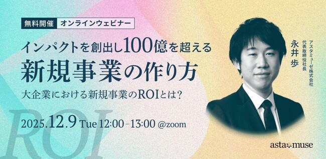アスタミューゼ株式会社(本社:東京都千代田区、代表取締役社長 永井歩)は、2025年12月9日(火)12:00-13:00に、新規事業担当者、経営企画担当者向けの無料ウェビナー「インパクトを創出し100億を超える新規事業の作り方 ~大企業における新規事業のROIとは?~」を開催いたします。