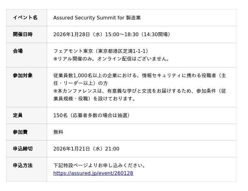 「Assured Security Summit for 製造業」開催概要[表: https://prtimes.jp/data/corp/34075/table/760_1_537cb6e6d91a93fddaa46f96d0395572.jpg?v=202512120545 ]