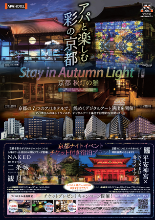 アパホテルネットワークとして全国最大の1,019ホテル・139,937室(建築・設計中、海外、アパ直参画ホテルを含む)を展開するアパホテル株式会社(本社:東京都港区赤坂3丁目2‐3 社長 元谷 芙美子)は、京都市の7つのアパホテルで煌めくデジタルアートの演出を行い、幻想的にライトアップした空間でお客様をお迎えします。期間は11月17日(月)から2026年2月28日(土)迄開催し、「二条城」「平安神宮」のナイトイベントの入場チケット付き宿泊プランの販売や総勢300名様へのチケットプレゼントキャンペーンも開催します。本企画は、観光地の混雑のピークが特定の時間帯に集中することを避ける「ピークオフ運動」を行いながら、アパホテルとして京都エリアの文化発信と観光促進への地域貢献を目的としています。