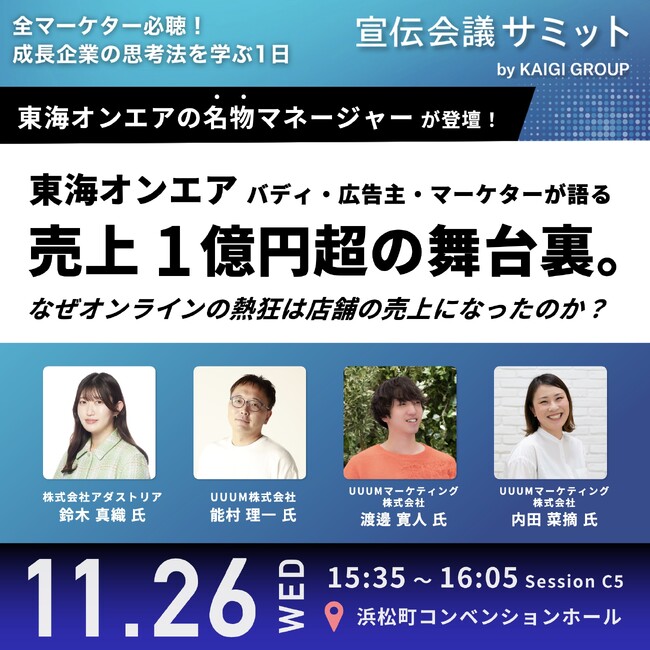 UUUM株式会社(本社:東京都港区、代表取締役 社長執行役員:梅景 匡之、以下UUUM)は、2025年11月26日(水)に開催される「宣伝会議サミット」に、東海オンエアのバディ・広告主・マーケターが登壇し、「東海オンエアバディ・広告主・マーケターが語る売上1億円超の舞台裏。なぜオンラインの熱狂は店舗の売上になったのか?」と題したトークセッションを行うことをお知らせします。