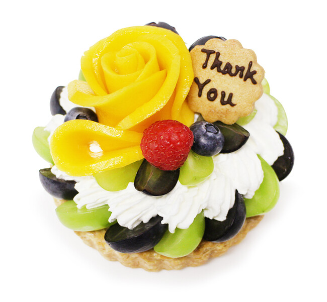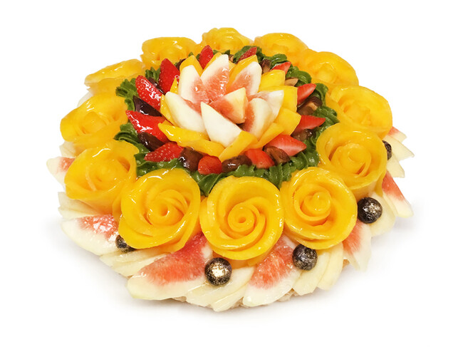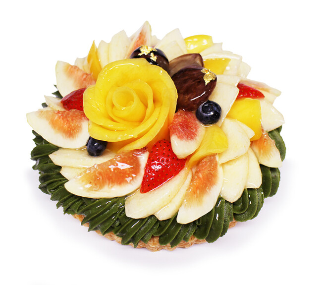 よく熟したマンゴーと、独特な食感のいちじくと栗、ぶどう、いちごを、ほろ苦い抹茶マロンクリームと合わせました。マンゴーの美しいバラを飾り付けた、敬老の日限定ケーキです。