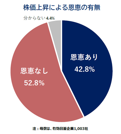 昨今の株価の上昇による恩恵を直接・間接問わず受ける(見込み含む)と考えるか尋ねたところ、「恩恵あり」とした企業は42.8%と4割を超えた。