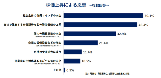 具体的な恩恵としては、「社会全体の消費マインドの向上」(50.1%)が最も高くなった(複数回答、以下同)。次いで、直接的な恩恵である「自社で保有する有価証券などの資産価値の上昇」が46.4%、「個人の購買意欲の向上」が32.9%で続いた。