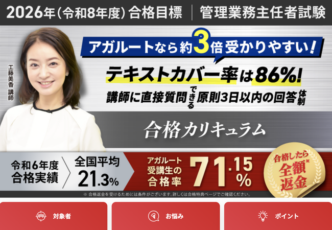 株式会社アガルート(本社:東京都新宿区、代表取締役:岩崎 北斗、以下「アガルート」)が運営する「アガルートアカデミー」は、【2026年合格目標】管理業務主任者試験合格カリキュラム(フル・ライト)をリリースいたしました。