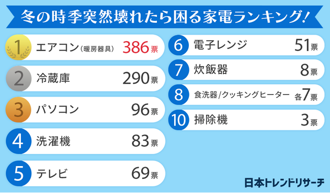 あなたが「冬の時季に壊れたら困る家電」は何位にランクインしていましたか?