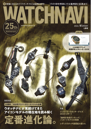 WATCHNAVIは、時計選びに役立つ情報をお届けし続けて創刊25周年! 株式会社ワン・パブリッシング(東京都港区/取締役社長:松井謙介)は、2025年11月21日(金)に「WATCHNAVI 2026 Winter(Vol.100)」(特別定価:1200円(税込))を発売いたしました。