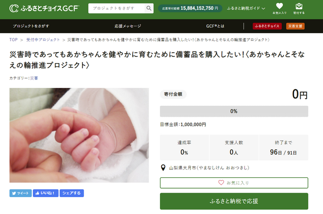 山梨県大月市(市長:小林 信保、以下「大月市」)と国内最大級のふるさと納税総合サイト「ふるさとチョイス」( https://www.furusato-tax.jp/ )を企画・運営する、株式会社トラストバンク(本社:東京都渋谷区、代表取締役:川村憲一、以下「トラストバンク」)は、本日12月1日トラストバンクが提供する、ふるさと納税制度を通じてクラウドファンディング型で寄付を募る仕組み「ガバメントクラウドファンディング(R)」(以下「GCF(R)」)で、赤ちゃんのための防災整備を目的としたプロジェクトを開始します。募集期間は2023年12月1日~2024年2月29日で、目標寄付金額は100万円です。