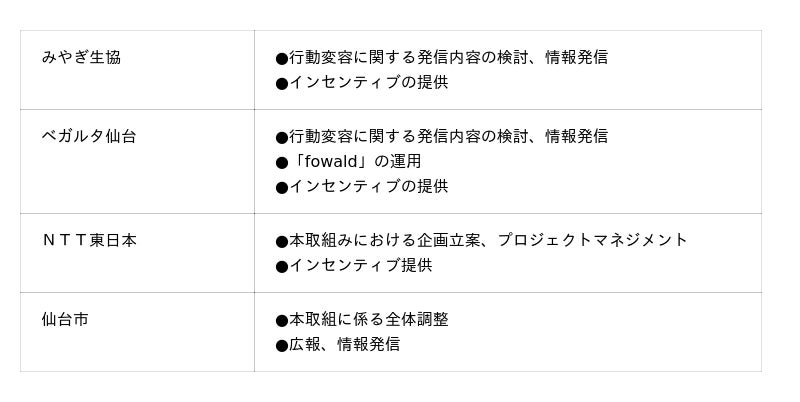 みやぎ生活協同組合(代表理事:尾川 輝敏、以下 みやぎ生協)、株式会社ベガルタ仙台(代表取締役:板橋 秀樹、以下 ベガルタ仙台)、NTT東日本株式会社 宮城事業部(執行役員宮城事業部長:須藤 博史、以下 NTT東日本)は、仙台市と連携して仙台市民にアプリケーションを通じて脱炭素化につながる行動を促す情報発信を行うことで、市民の環境配慮行動を促進させる取組みを推進します。
