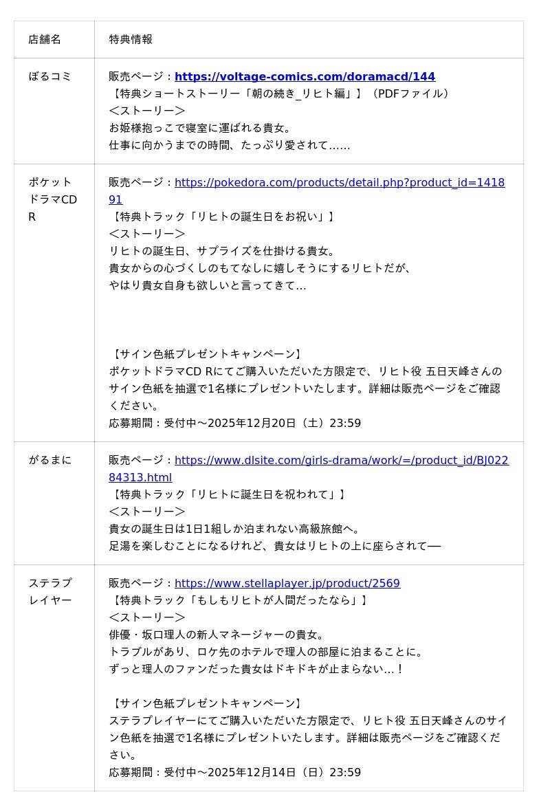 店舗ごとに購入特典をご用意しているほか、ポケットドラマCD Rとステラプレイヤーにてご購入の方を対象に、五日天峰さんのサイン色紙が抽選で1名様に当たるプレゼントキャンペーンも開催しております。