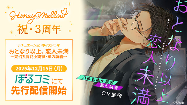 株式会社ボルテージ(本社:東京都渋谷区 代表取締役:津谷 祐司)は、シチュエーションボイスドラマレーベル「Honey Mellow」が2025年12月に設立3周年を迎えることをお知らせいたします。