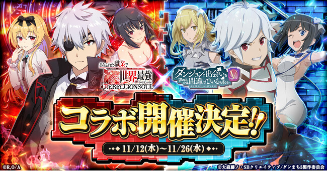 CTW株式会社は、G123で好評配信中のブラウザゲーム『ありふれた職業で世界最強 リベリオンソウル』にて、アニメ『ダンジョンに出会いを求めるのは間違っているだろうかV』とのコラボ開催を発表いたします。