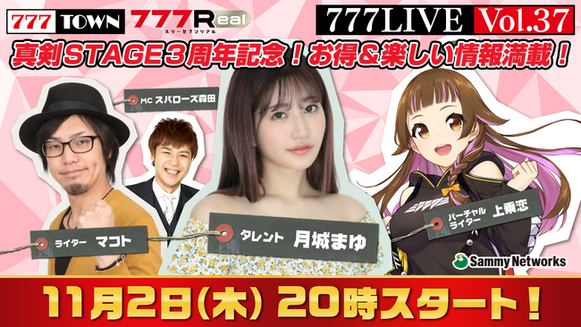 株式会社サミーネットワークスは、ぱちんこ・パチスロがパソコン、スマホで打てる「777TOWN(スリーセブンタウン)」、無料で遊んで豪華景品がもらえるスマホ向けサービス「777Real(スリーセブンリアル)」の生放送を、2023年11月2日(木)20時から配信いたします。