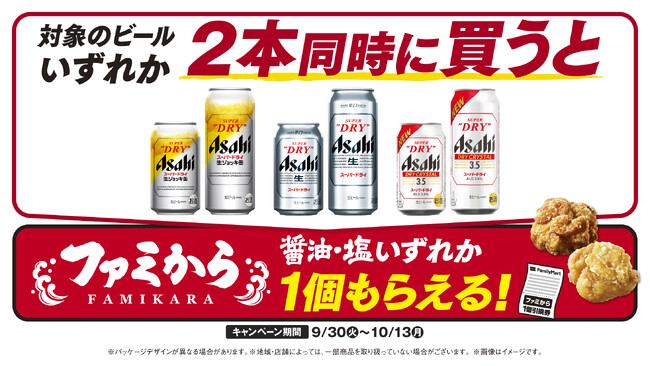 株式会社ファミリーマート(本社:東京都港区、代表取締役社長:細見研介)は、継続して取り組んでいる5つのキーワードの一つである「たのしいおトク」の一環として、2025年9月30日(火)から10月13日(月)まで、対象の「アサヒスーパードライ」各種いずれか2本を同時に買うと、「ファミから(醤油または塩)」が1個もらえる無料引換券が発券されるキャンペーンを実施いたします。