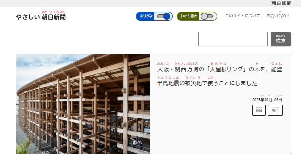 株式会社朝日新聞社(代表取締役社長CEO:角田克)のグループ会社であるアルファサード株式会社(代表取締役社長:森崎賢太郎)は、朝日新聞社との合意のもと、2025年10月14日、朝日新聞のニュースをやさしい日本語で伝えるメディア「やさしい朝日新聞」を公開しました。 アルファサードは、ウェブ上の情報を利用しやすくする「ウェブアクセシビリティ」を重視し、やさしい日本語の作成支援技術を強みとしています。やさしい日本語で、ニュースをもっと多くの人に届けていきます。