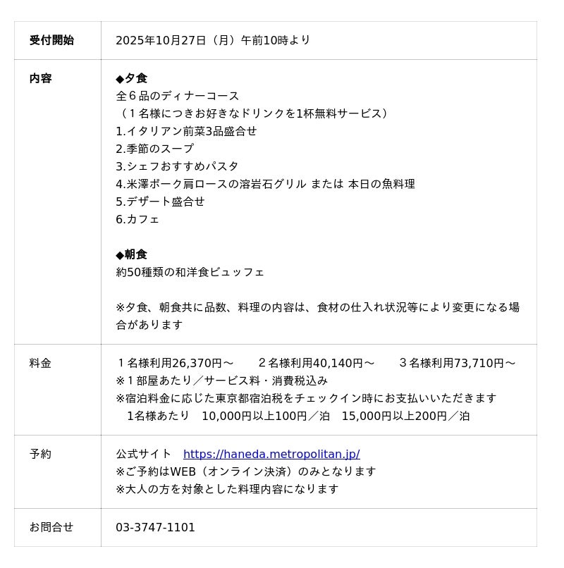 羽田空港第3ターミナルから1駅の天空橋駅より徒歩1分に位置するホテルメトロポリタン 羽田(運営/日本ホテル株式会社 総支配人/塩原 健)では、同ホテル5階に位置する、開放的な川沿いの移りゆく都心の景色をお楽しみいただける「restaurant il CIELO HANEDA(レストラン イル チェーロ 羽田)」での夕食と朝食がついた宿泊プランを販売します。