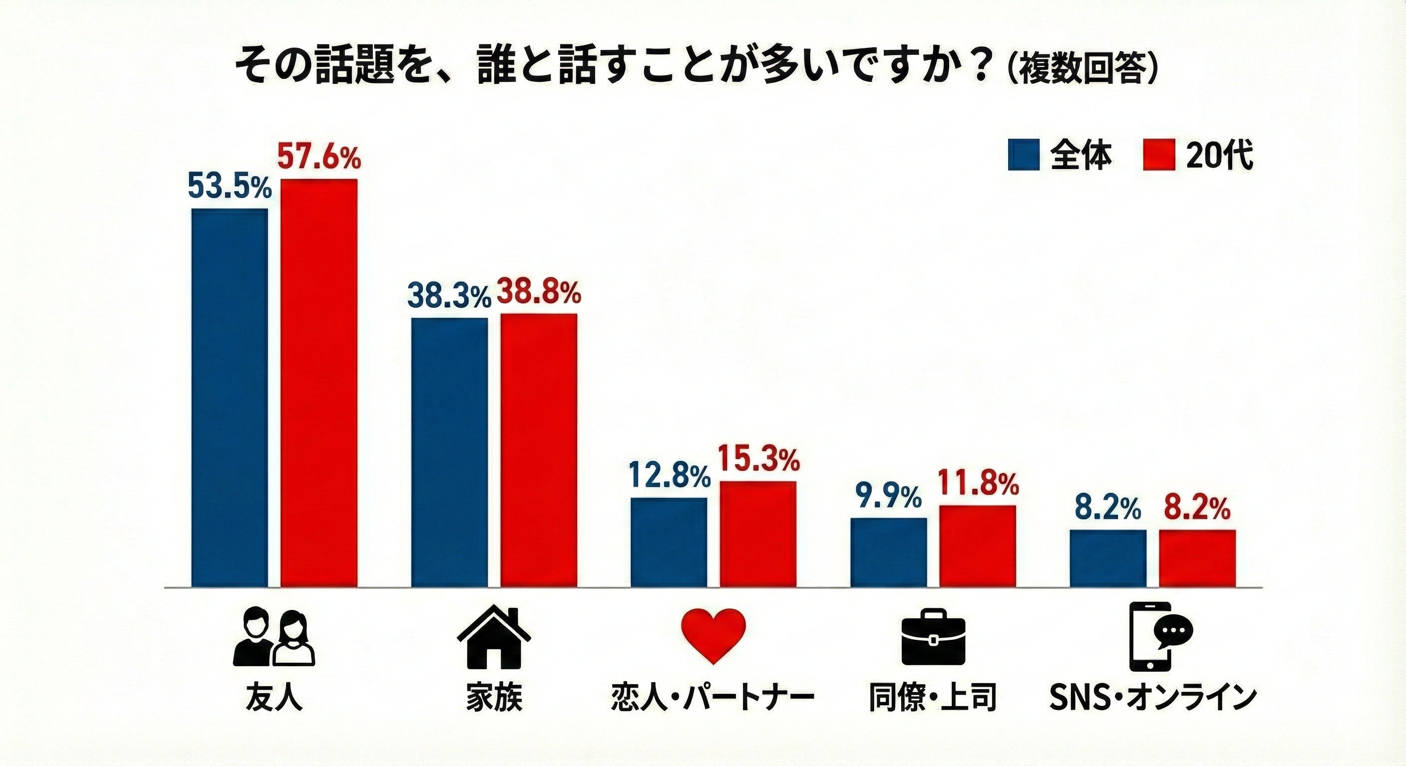「その話題を、誰と話すことが多いですか?」という質問では、全世代で「友人(53.5%)」が1位となり、次いで「家族(38.3%)」が続きました。一方で、「SNSやオンラインコミュニティ」と回答した人は全体で8.2%にとどまりました。これは20代の若い世代も同数値で、SNSで日常を発信することが当たり前になった現代においても、人生の深いテーマや悩みといった“ダマってられない”本音については、信頼できる身近な相手と顔を合わせて語り合いたいという心理が見て取れます。