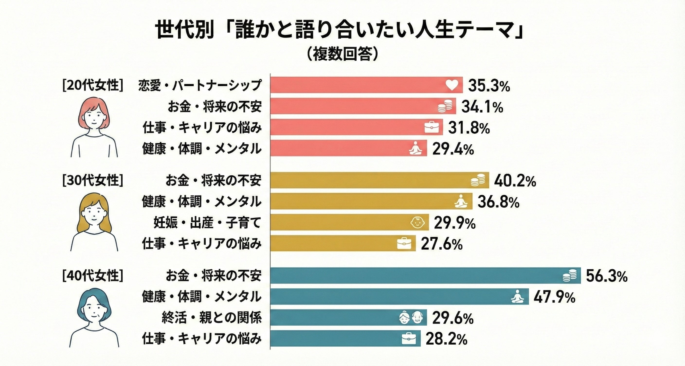 30代になると「健康・体調・メンタル」への関心が急上昇し、20代(29.4%)から大きく数値を伸ばしています。また、「妊娠・出産・子育て(29.9%)」と「仕事・キャリアの悩み(27.6%)」が拮抗しており、家庭と仕事の両立に悩み始めるリアルな姿が浮かび上がります。