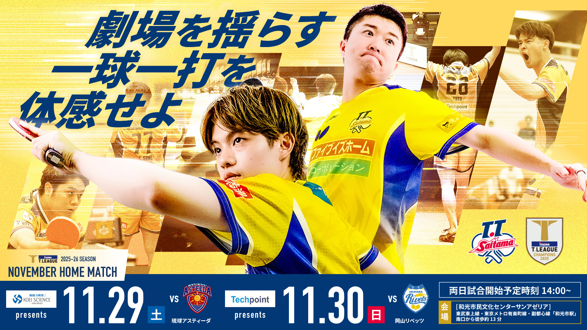 「健やかな腸内フローラへ」をテーマに乳酸菌生産物質の研究・製造・販売を行う株式会社光英科学研究所(本社:埼玉県和光市、代表取締役社長:小野寺 洋子)は、地域貢献活動の一環で、プロ卓球チームT.T彩たまをブロンズパートナーとして応援しています。そして来たる2025年11月29日(土)和光市民文化センター サンアゼリア 大ホールにて「光英科学研究所プレゼンツ T.T彩たまホームマッチ~T.T彩たま vs. 琉球アスティーダ~」が開催されることをお知らせいたします。本大会開催を記念して、当社協賛枠より抽選で100名様を無料ご招待いたします。1グループ最大4名様までお申込みいただけます。応募はGoogleフォームにて受付いたします。