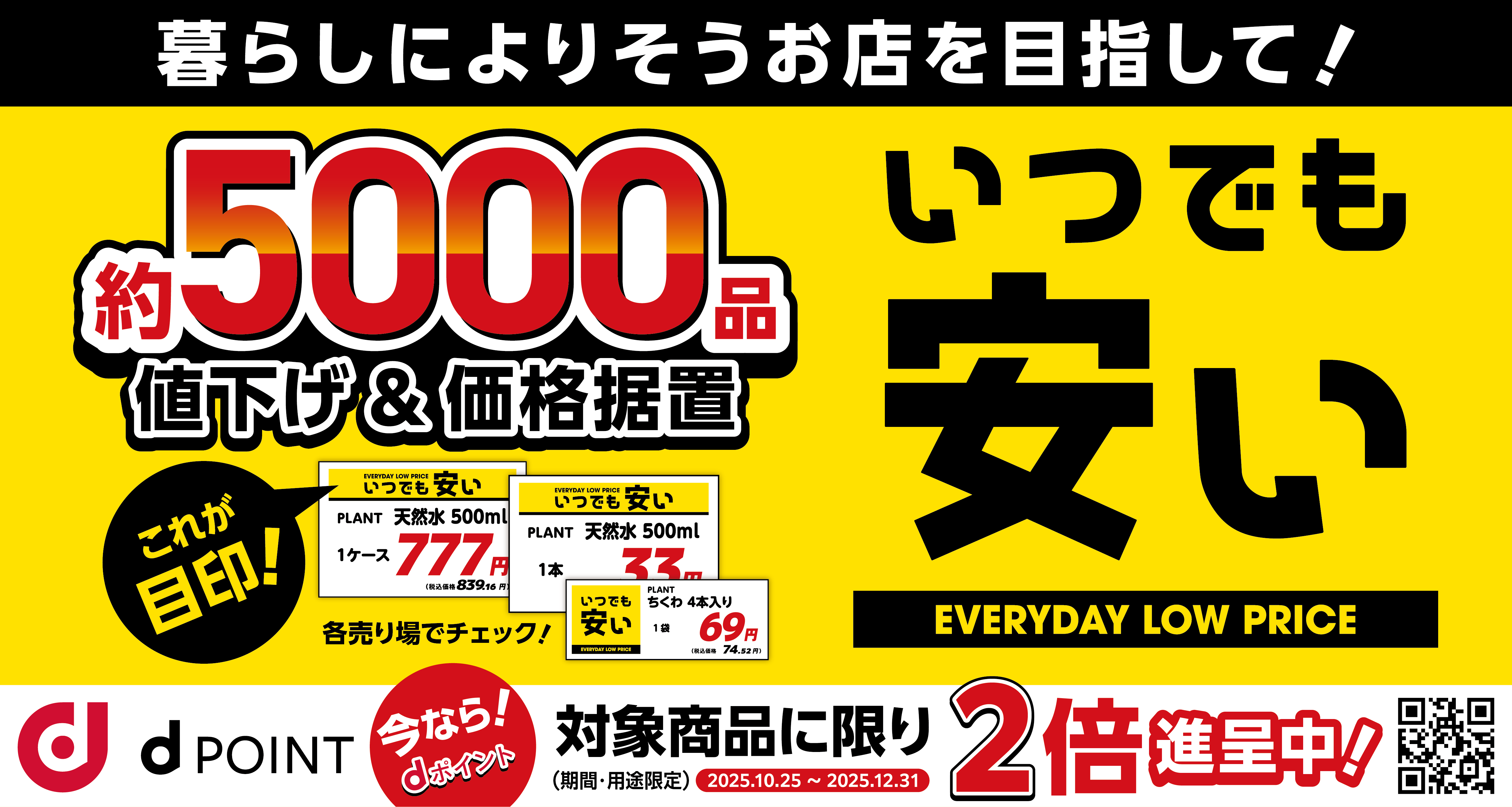 株式会社PLANT(本社:福井県坂井市 代表取締役社長:三ッ田 泰二)は、2025年10月1日(水)より食料品や日用品などの生活必需品をお求めやすい価格でご提供するエブリデイロープライスをSUPER CENTER PLANT全23店舗で開始しております。 この度、対象商品が約5,000品となりましたので、改めてエブリデイロープライス企画『いつでも安い』を2025年10月25日(土)より開始いたします。 近年、物価高によって家計への負担が増す中、お客様の節約志向はますます高まっています。