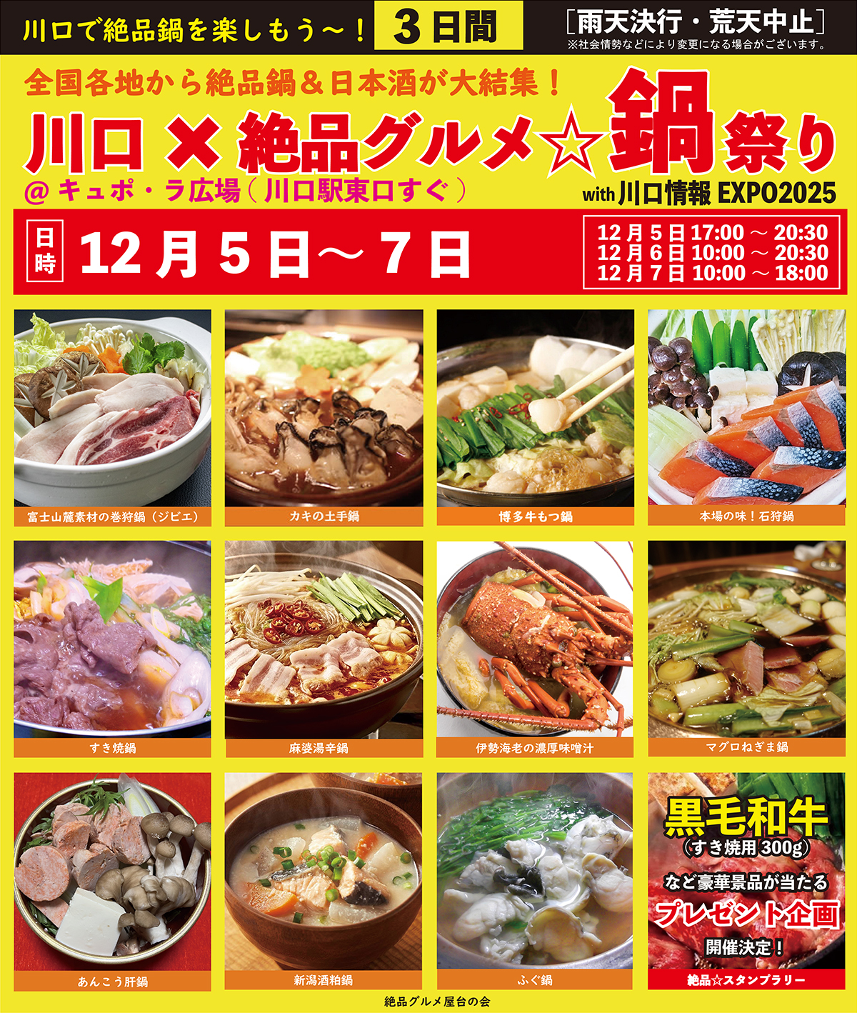 Mapion > ニュース > リリース > 2025年12月5日~7日、川口駅前キュポ・ラ広場で“庶民派食フェス”「川口×絶品グルメ鍋祭り2025」を開催