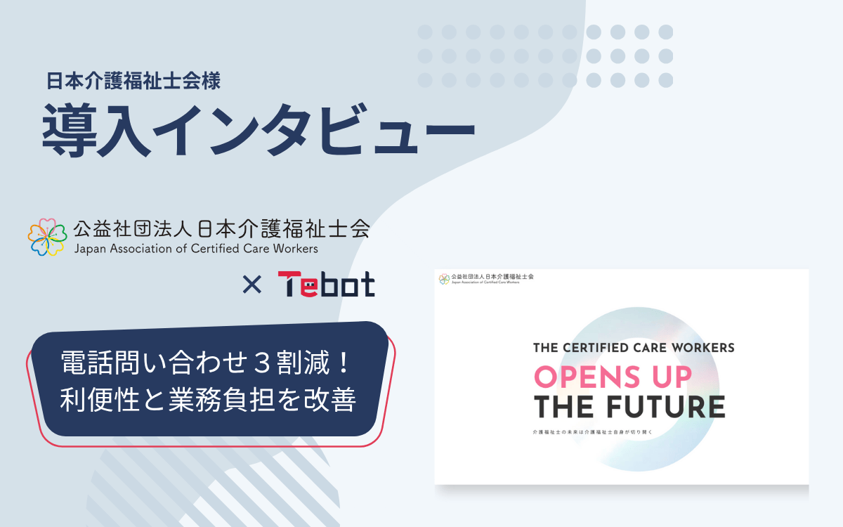 AIチャットボット「Tebot(ティボット)」の開発・販売事業を行う、株式会社アノテテ(本社:大阪府大阪市、代表取締役:岸本 渉、以下 アノテテ)は、公益社団法人日本介護福祉士会(介護福祉士有資格者による職能団体、会長:及川 ゆりこ、以下「日本介護福祉士会」)の導入事例を公開いたしました。本事例では、「Tebot(ティボット)」を導入された経緯や決め手・効果・現在の活用状況についてご紹介しています。