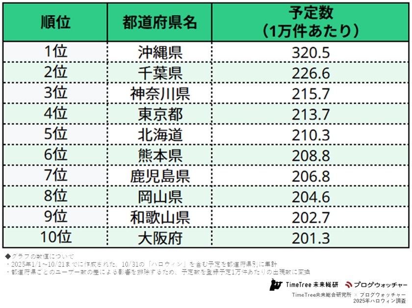 TimeTree未来総研では、昨年10月にもハロウィンに関する調査( https://timetreeapp.com/intl/ja/newsroom/2024-10-18/future-research-institute-report6 )を実施しております。前回の調査では、ハロウィンを楽しむのが10代の若年層から子育て層に移り変わりつつある兆しをお知らせしましたが、今回のブログウォッチャー社との共同調査では、「位置情報」に着目し、ハロウィンの予定が多い都道府県として沖縄県が際立っていることや、規制の取り組みで注目される渋谷が未だ根強くハロウィンのスポットとして受け入れられていることが明らかになりました。