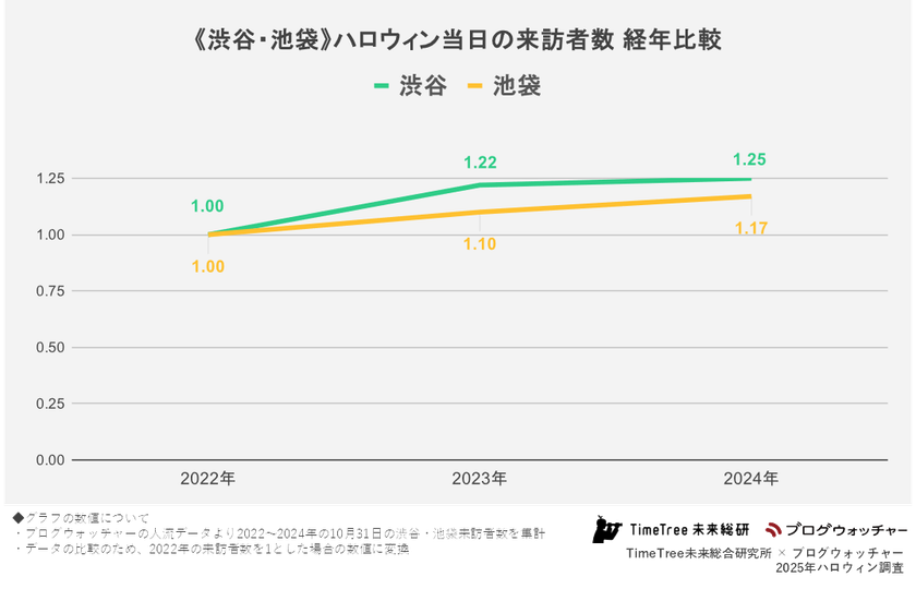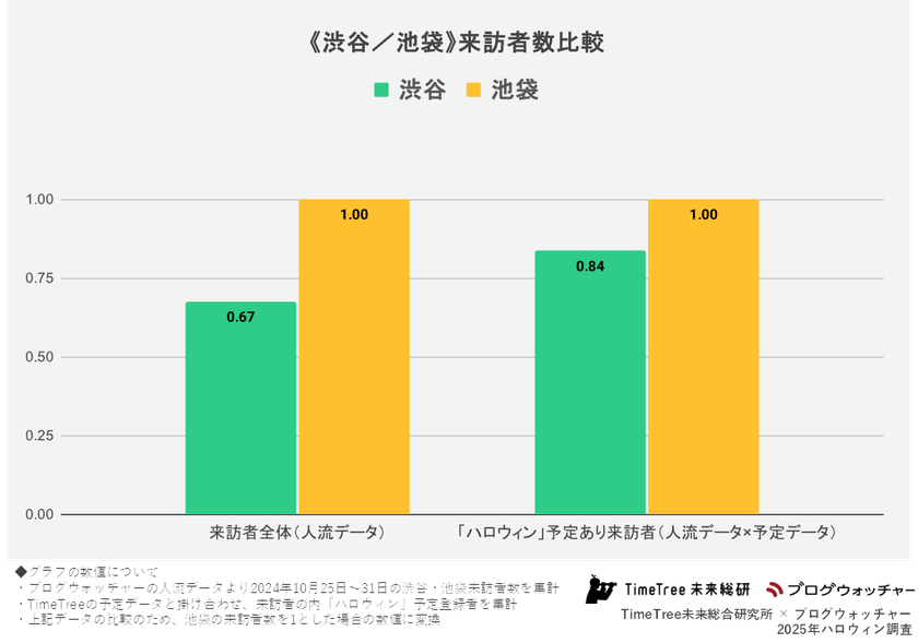 株式会社TimeTree(本社:東京都新宿区、代表取締役社長:深川 泰斗)の社内研究所『TimeTree未来総合研究所』( https://timetreeapp.com/intl/ja/future-research-institute )と、位置情報データの収集・分析・活用サービスを提供する、株式会社ブログウォッチャー(本社:東京都中央区、代表取締役社長:新村 生、以下「ブログウォッチャー」)は共同でTimeTree上に登録された予定データとブログウォッチャーが保有する、人々の移動に関連した人流データをもとに、ハロウィンに関する動向を分析しました。