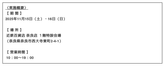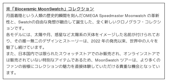 近鉄百貨店 奈良店では、2025年11月15日(土)・16日(日)の2日間限定で「MoonSwatchツアー」を奈良県で初開催します。MoonSwatchツアーとは、SwatchとOMEGAとの革新的なコラボレーションにより誕生した「Bioceramic MoonSwatch(※)」コレクションを、より多くの人々に届けるべく、特別なロードトリップイベントとして、各地で展開しています。イベント期間中には、OMEGA×Swatchの特別なコラボコレクション「Bioceramic MoonSwatch」を販売します。