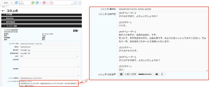 さらに本連携では、CRM機能との連携も実現。ボイスボットによる応対内容のテキストと音声データを、転送時にBrekeke CRMの画面上に即時表示できるようになりました。
