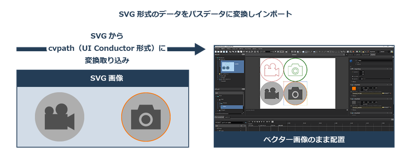 SVG Tiny1.2規格をサポートし、パスデータとしてUI Conductorに取り込むことが可能になりました。解像度に依存しない高品質な表示を実現し、多様な画面サイズに対応できるようになります。